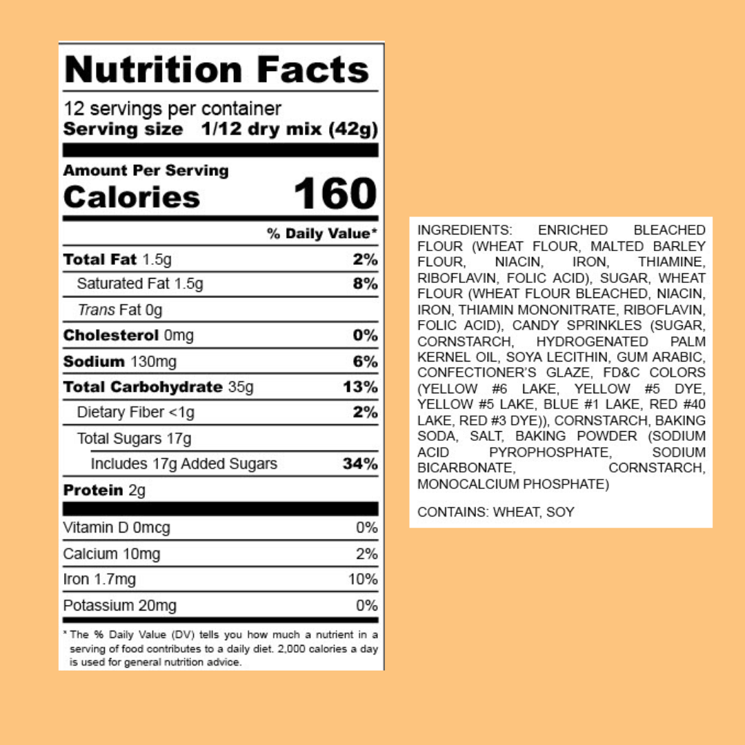 CONFETTI INGREDIENTS: ENRICHED BLEACHED FLOUR (WHEAT FLOUR, MALTED BARLEY FLOUR, NIACIN, IRON, THIAMINE, RIBOFLAVIN, FOLIC ACID), SUGAR, WHEAT FLOUR (WHEAT FLOUR BLEACHED, NIACIN, IRON, THIAMIN MONONI-TRATE, RIBOFLAVIN, FOLIC ACID), CANDY SPRINKLES (SUGAR, CORNSTARCH, HYDROGENATED PALM KERNEL OIL SOYA LECTHIN, GUM ARABIC, CONFECTIONER'S GLAZE, FD&C COLORS (YELLOW #6 LAKE, YELLOW #5 DYE, YELLOW #5 LAKE, BLUE #1 LAKE, RED #40 LAKE, RED #3 DYE)). CORNSTARCH, BAKING SODA, SALT, BAKING POWDER (SODIUM ACID PYROPHOSPHATE, SODIUM BICARBONATE, CORNSTARCH, MONOCALCIUM PHOSPHATE